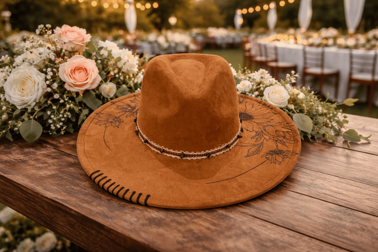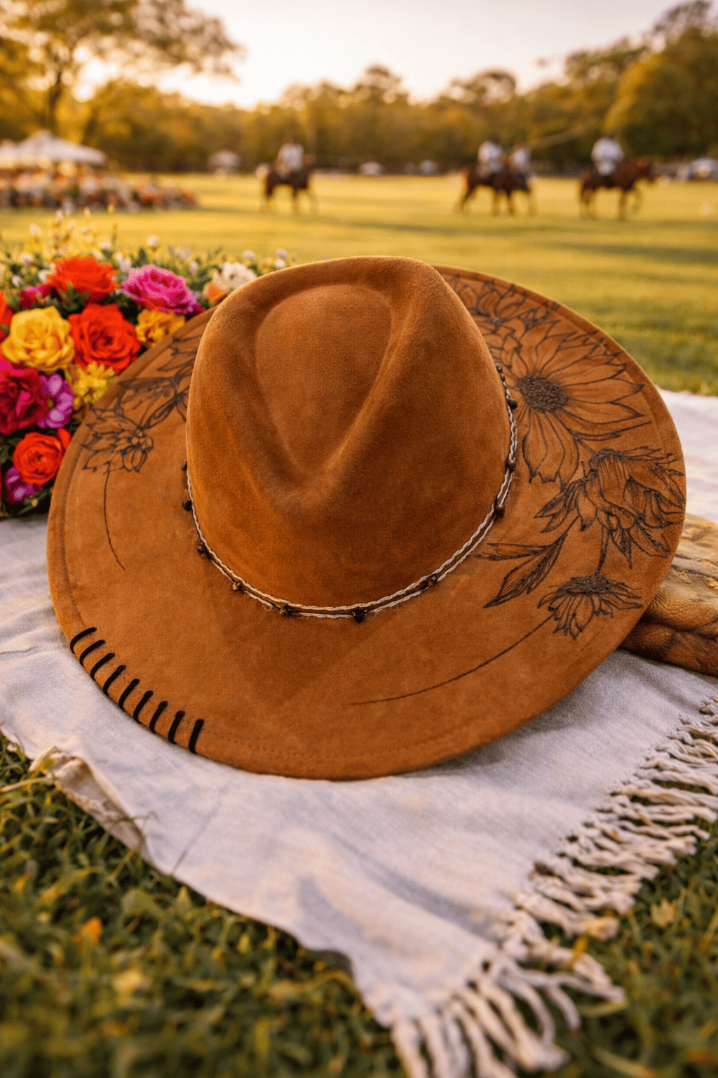 The Sunflower Reverie was made for golden afternoons and conversations that linger just a little longer. From the beautiful tiger’s eye detail along the brim to the flowing sunflower design that sweeps effortlessly across it, this hat is simply breathtaking.